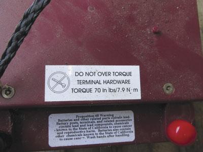 Upon reinstallation, be sure not to overtighten the battery terminals. The terminals on a sealed battery require a relatively low torque, and overtightening can cause them to leak.
