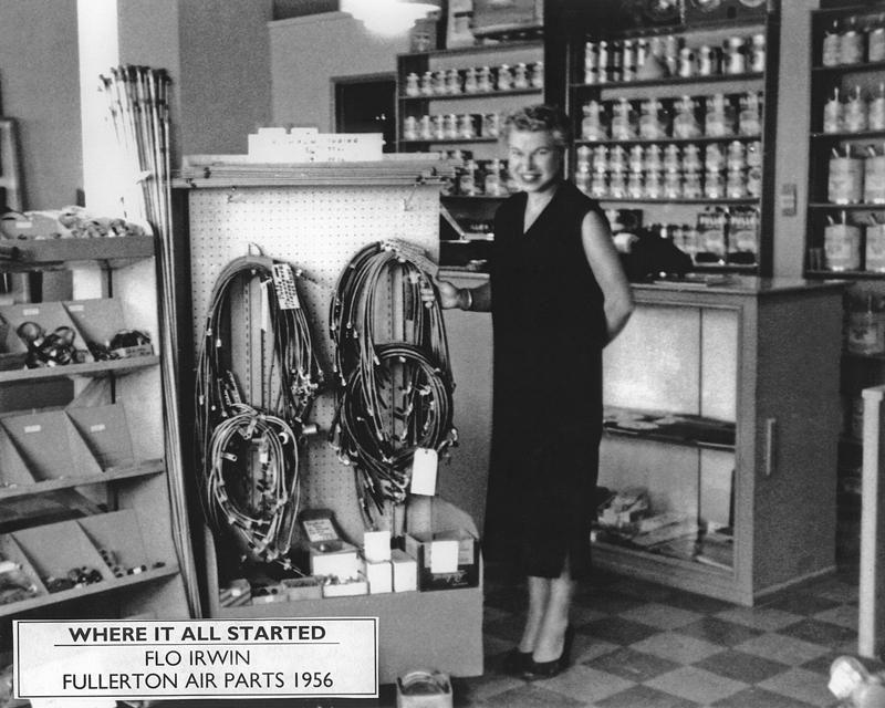 Aircraft Spruce moves to larger building at 128 W. Wilshire Ave. in Fullerton and now carries steel and aluminum tubing and sheets, hardware and an expanding range of products for homebuilders. Flo’s husband Bob Irwin leaves the aerospace industry to join Aircraft Spruce, and their son Jim Irwin starts as a parts packer and wood cutter during high school.