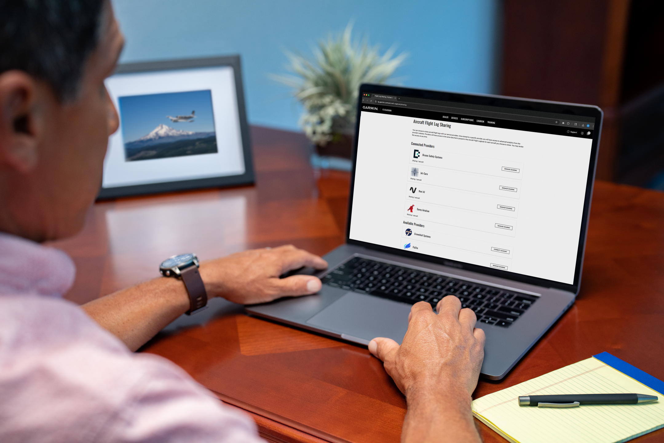 All data analysis integrations are managed through flyGarmin.com. Once sharing is enabled, all current and future flight logs for the selected aircraft will be automatically shared with the service provider. Access to future logs can be changed at any time. Aircraft flight logs are available on flyGarmin.com today for aircraft owners using compatible Garmin avionics. For additional information, visit Garmin.com/FlightLogs.