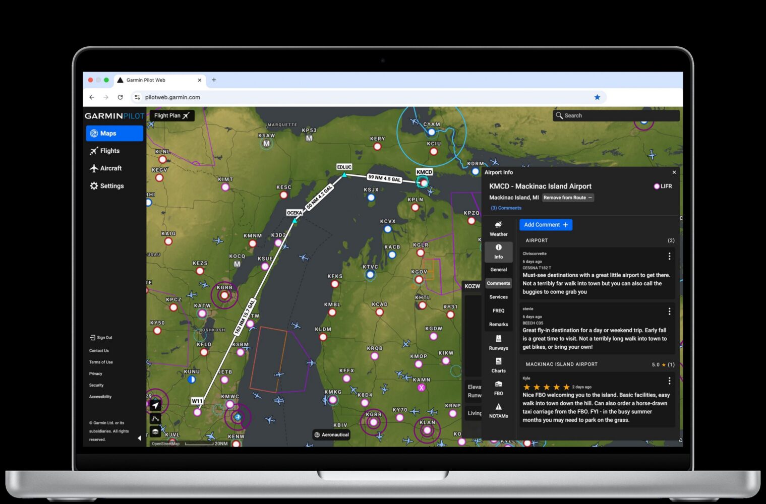 When visiting new airports, pilots can utilize knowledge from local aviators shared in new comments. This feature will help users collaborate with other pilots, as they share up-to-date information. Key details such as facility conditions, airport configurations in certain winds, and other local knowledge can be posted in the Airport Comments section of Garmin Pilot. These user-generated comments from pilots that have recently visited the airport will help keep other pilots aware of current airport conditions.