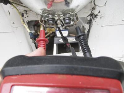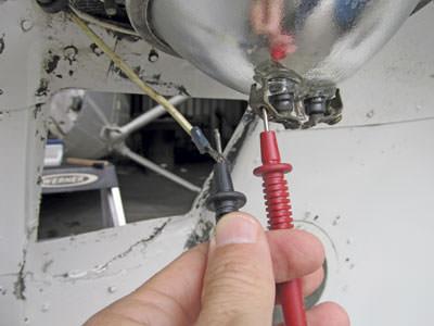 In the landing light circuit, voltage can easily be measured by placing the positive probe of the multimeter on the light terminal for the L1C or L2C wire (depending on which bulb is being checked) and the negative probe on a clean, bare metal area of the airframe for a ground. (Some owner-pilots use a small alligator clip to connect the black lead off the multimeter to a spot on the airframe. —Ed.)