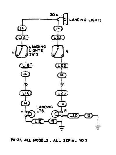 In figure 9-35 on page 24, the Piper Comanche landing light circuit, power comes from the bus bar to a 20-amp circuit breaker, which is a shared breaker for two separate landing light circuits. The number 14 indicates that the wire size for that section is 14 gauge.