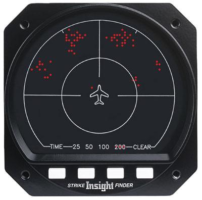 Insight Avionics manufactures a unit called the Strike Finder that analyzes individual strike signal properties to determine the bearing, range and severity. This data is plotted on an LED display as single orange dots. A stabilization module (not a rotating gyroscope) is available as a factory installed option; no field configuration or calibration of the module is required.