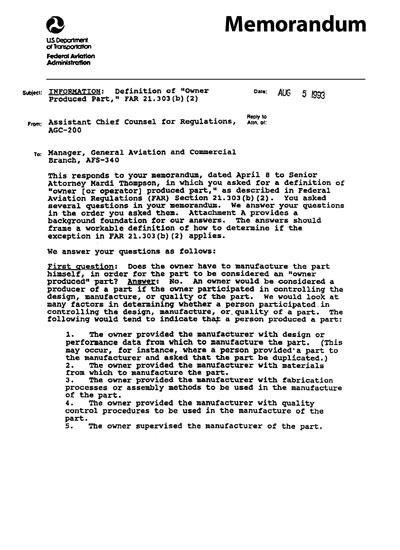When the FAA renumbered and revised Part 21 in 2009, it specifically made mention in the Federal Register that the interpretation memorandum issued on Aug. 5, 1993 was still operative.